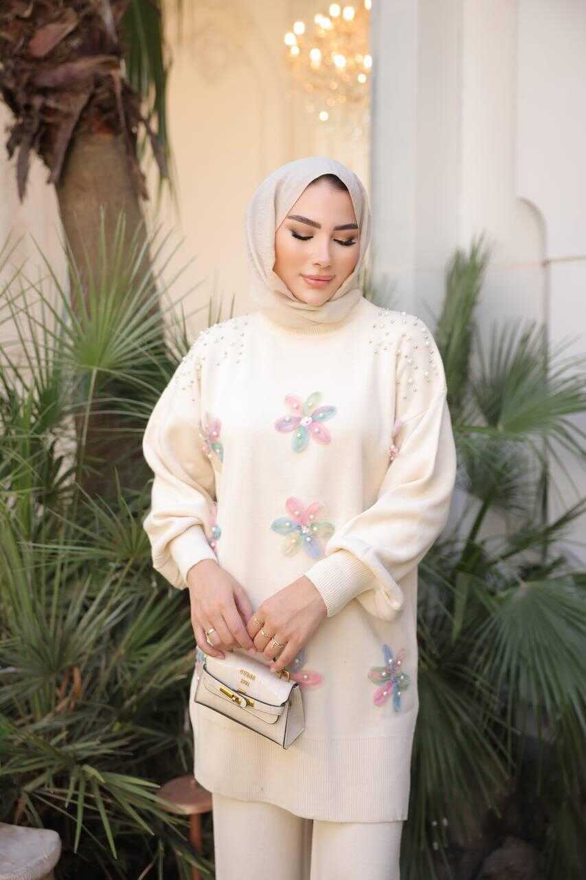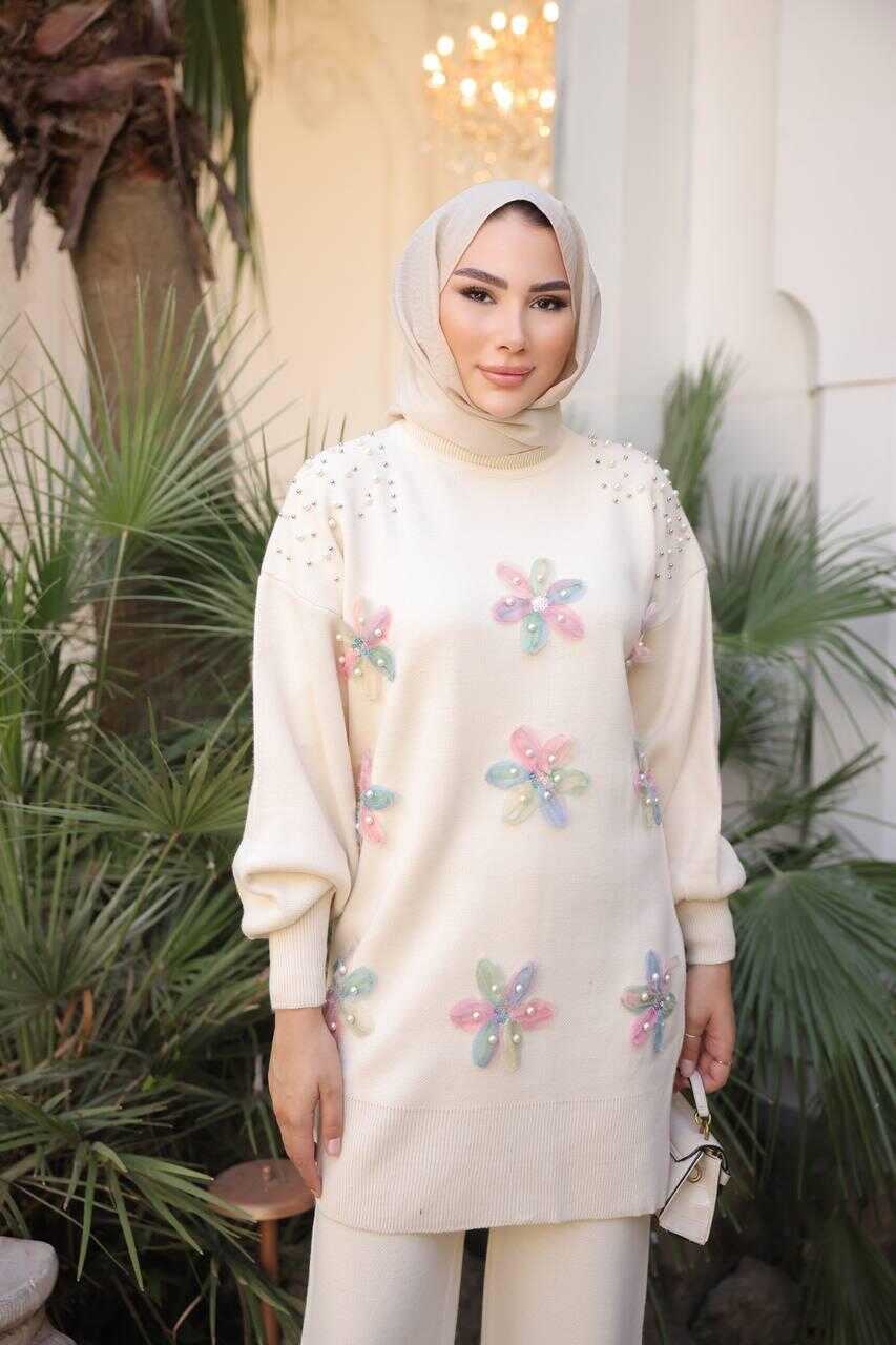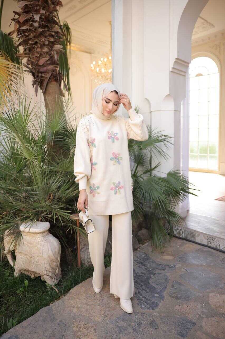 1006 TRİKO TAKIM KREM PEMBE ÇİÇEKLİ
