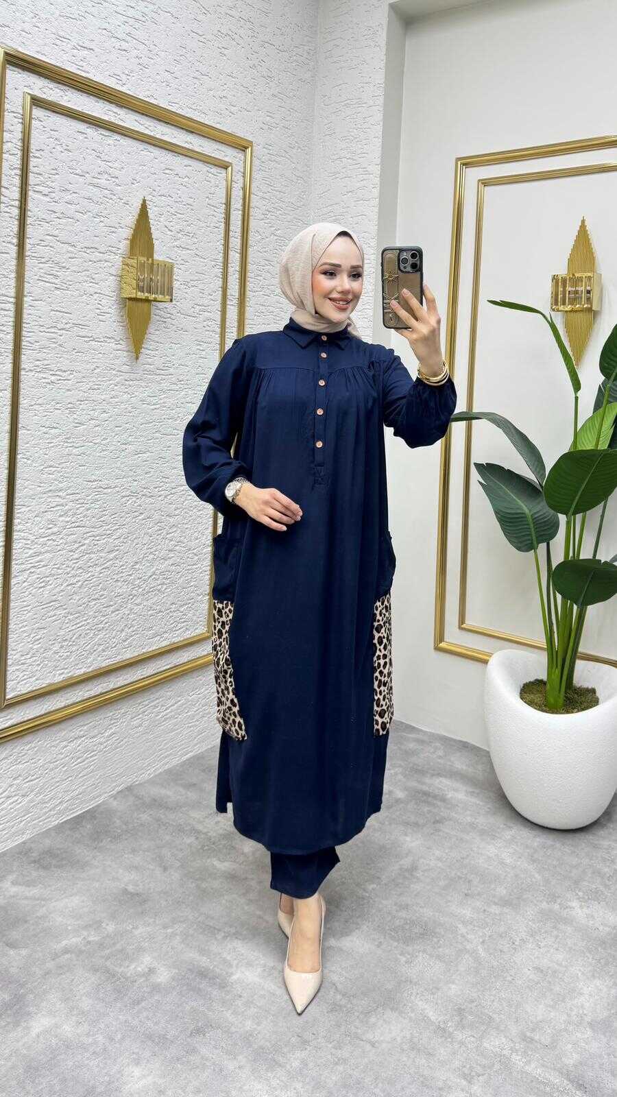 Rahat kalıbıyla efil efil bir takımdır. Pantolon beli lastiklidir.Tunik boy 120 cm'dir.İki cebi mevcuttur.